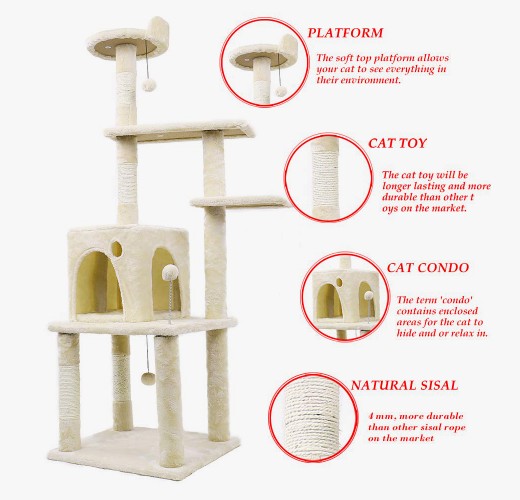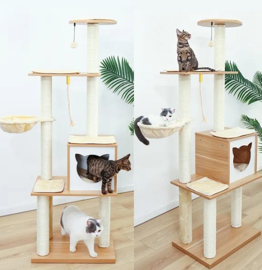 Na boku lezenia dreveného bytu v lezení stromu Cat Cat Tree sú tri horolezecké plošiny, z ktorých každý je dosť priestranný na to, aby mačky mohli voľne preskočiť a preskúmať. Tieto platformy zvyšujú priestor, aby sa mačky pohybovali okolo, a tiež im umožňujú cvičiť a zostať aktívni počas procesu lezenia. V spodnej časti je vo vnútri mačka s mäkkými vankúšmi, ktorá pre mačky poskytuje teplý a pohodlný priestor na spanie.